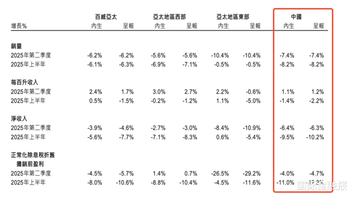 第二季度,其中国区啤酒销量同比减少7.4%、收入减少6.4%,好于第一季度,但仍不及市场预期,销量表现低于行业水平。