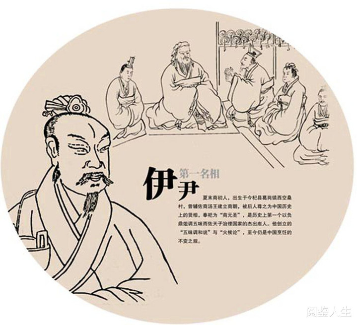 伊尹(原名伊挚),生卒年不详,出生地说法不一(有说河南,有说山东),刚出生就被遗弃在桑树林,幸得一位厨师收养,从此跟着养父在贵族家里“打工做饭”。
